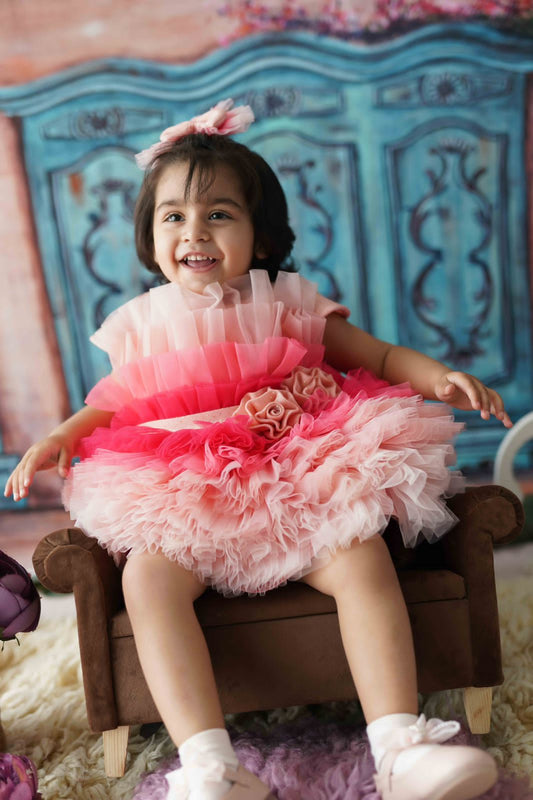 Shades Of Pink Multilayer Net Glitter Roses Dress