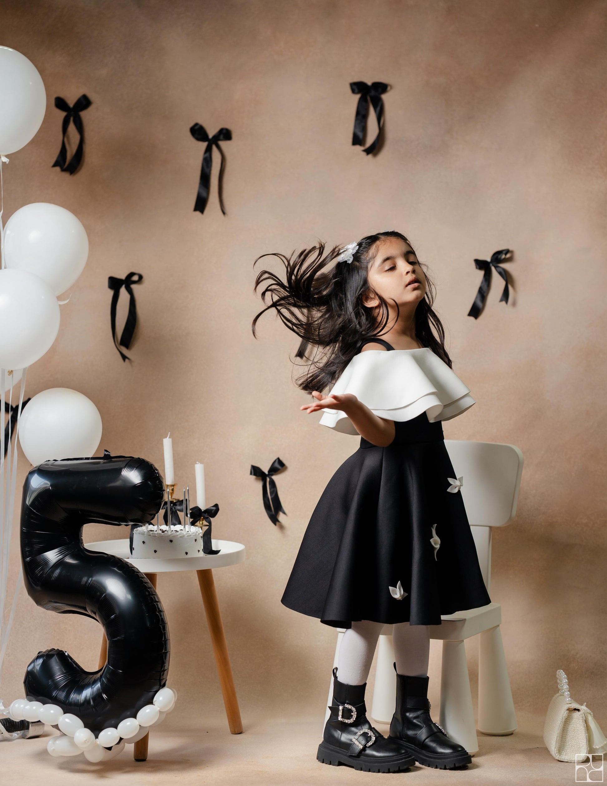 Black and Ivory double drape offshoulder style knee length dress with hand made 3D flowers on the skirt along with a matching neck choker.