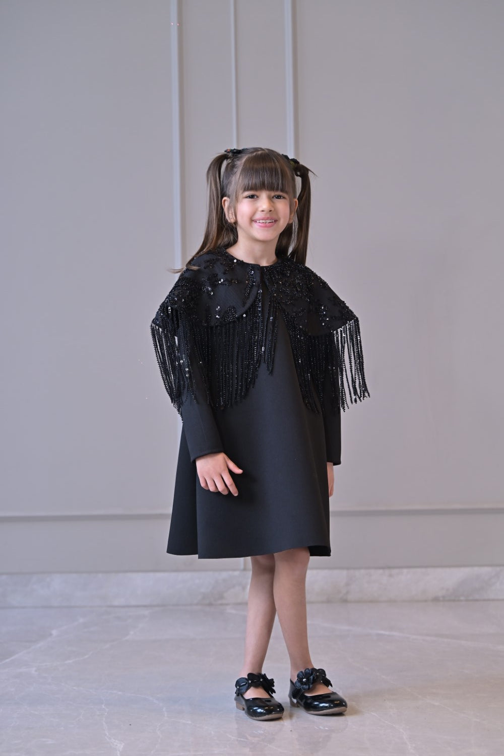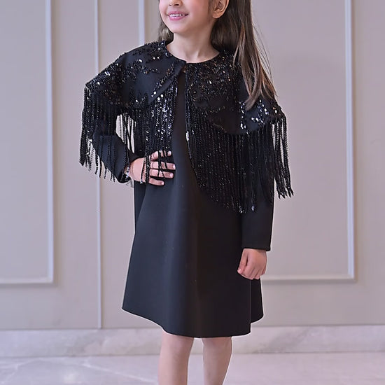 Black knee length dress with a detachable embroidered shoulder cape attached with black sequence hangings.