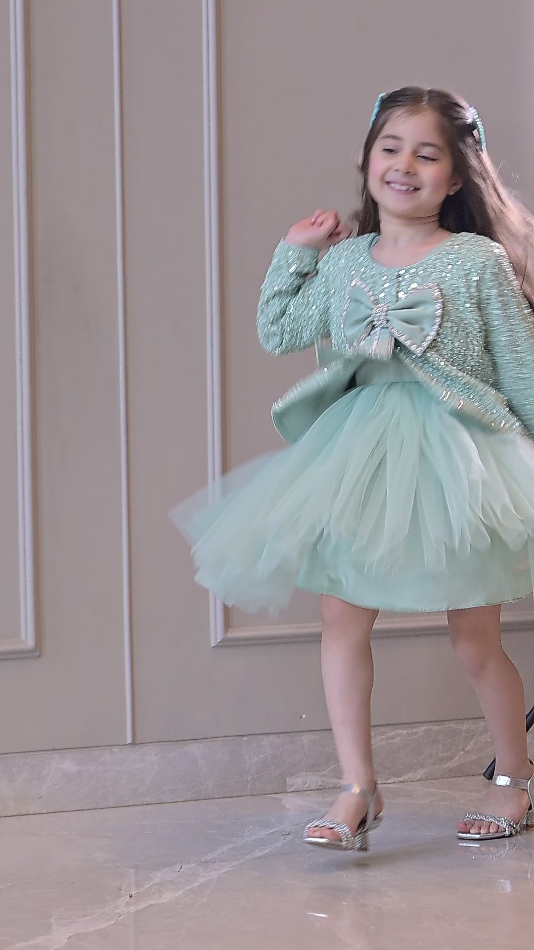 English green sequence detachable jacket with a handmade pearl sequence bow in the front along with a plain bodice and a net skirt knee length dress.
