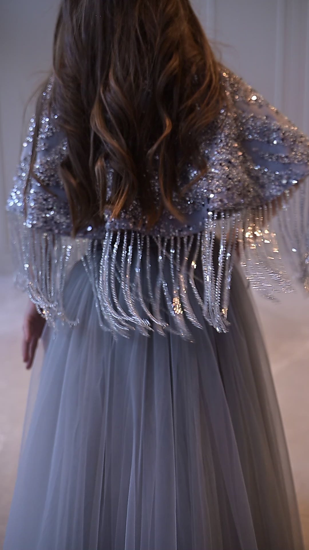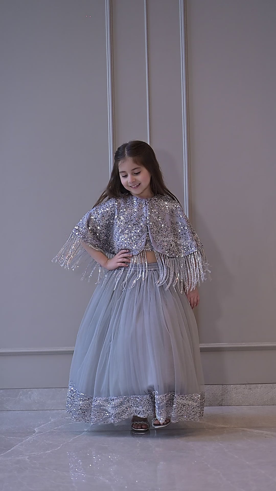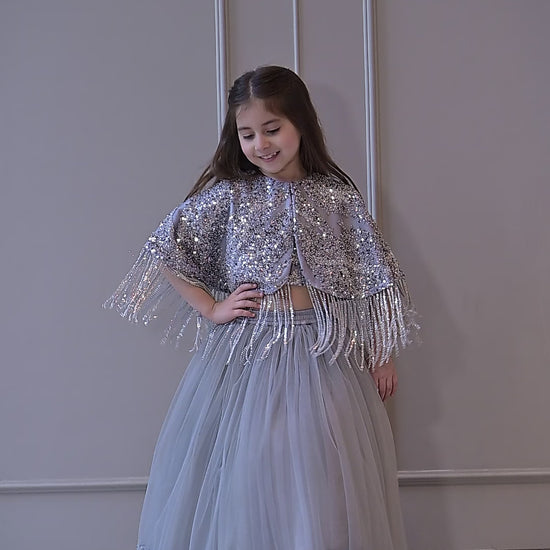 Grey silver sequence detachable cape with sequence bodice and silver sequence tassel frill and a net lehenga with border.