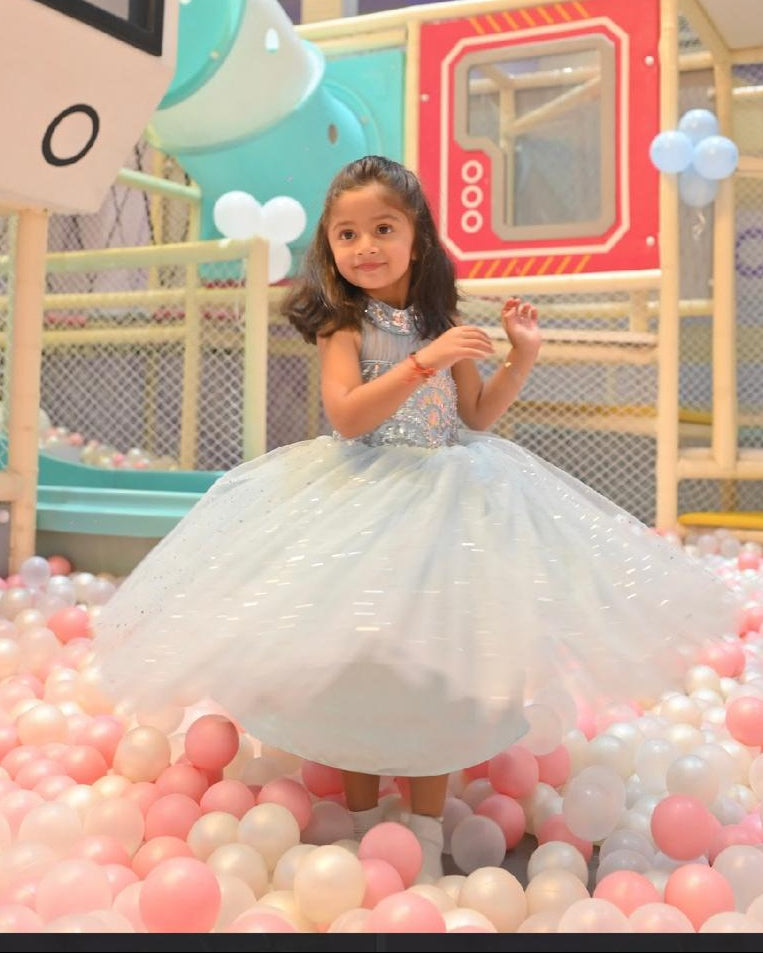 Ice blue sequence backless bodice full length gown with a bow tassel at the back.