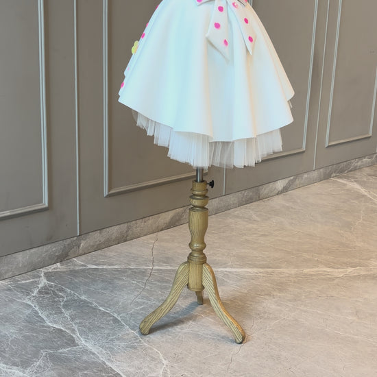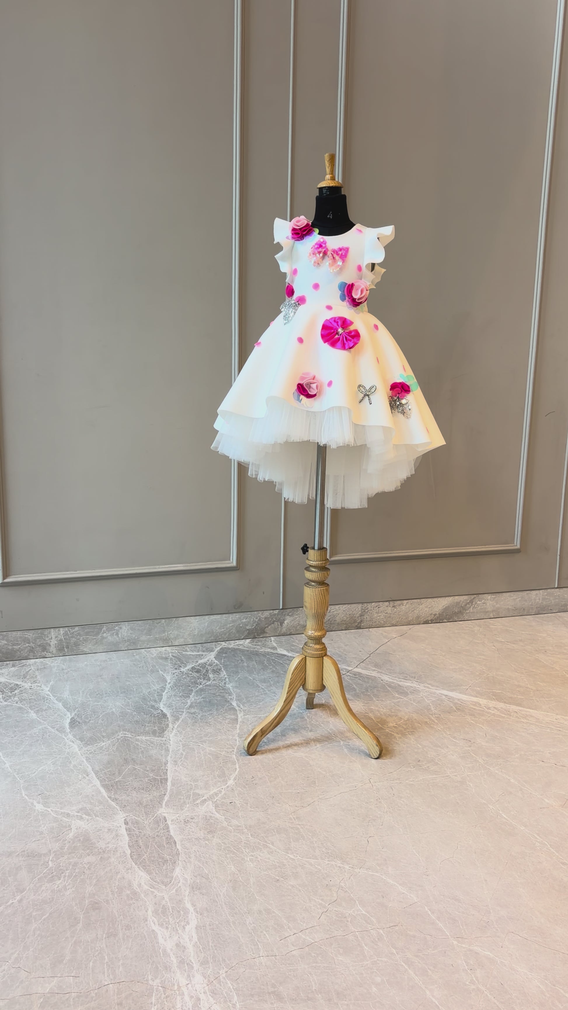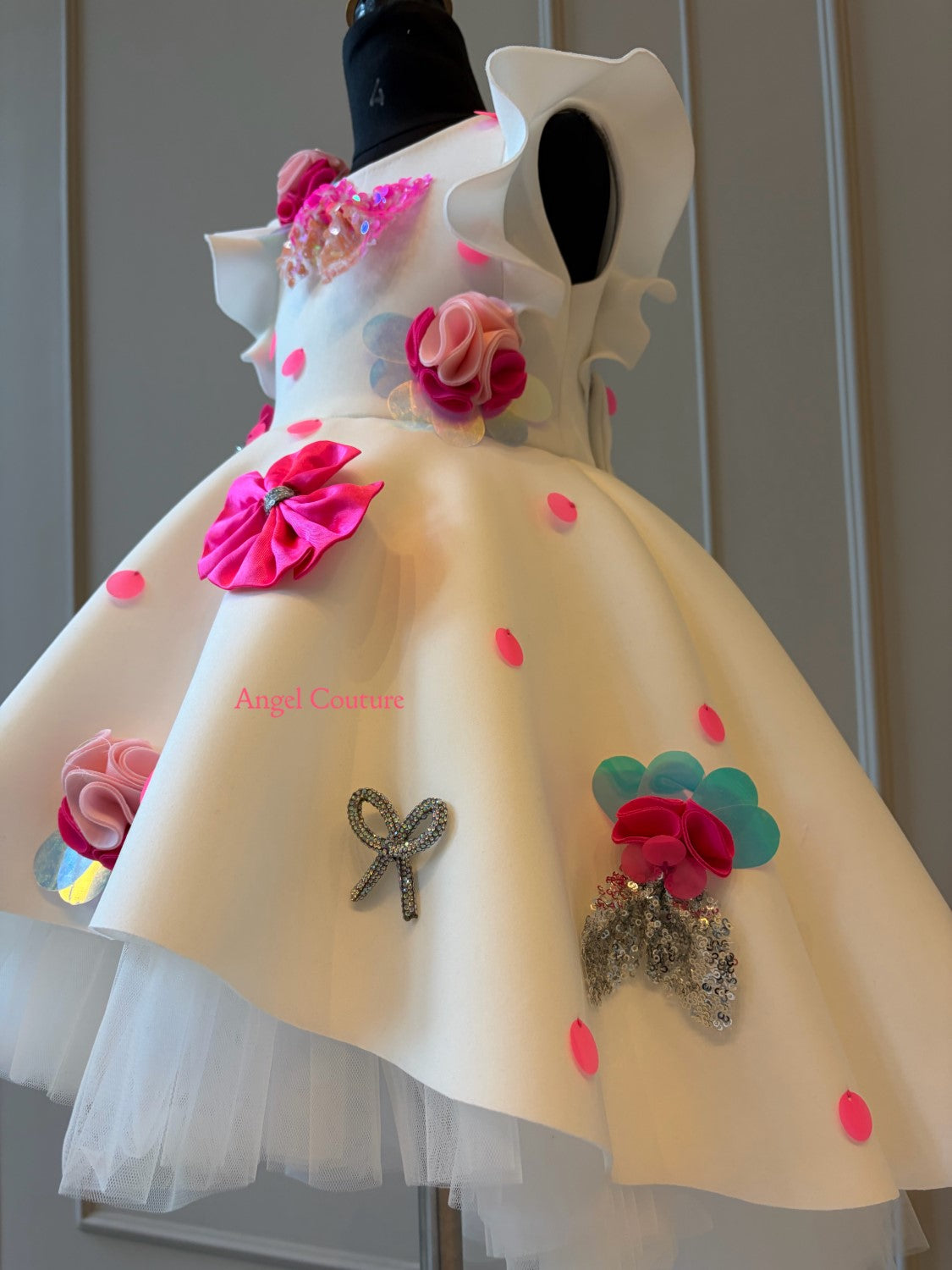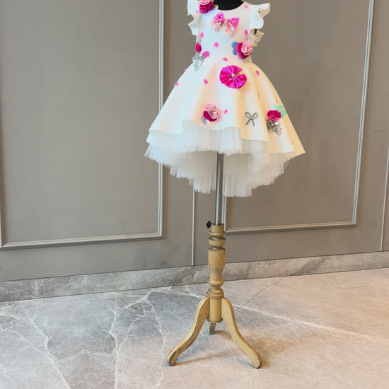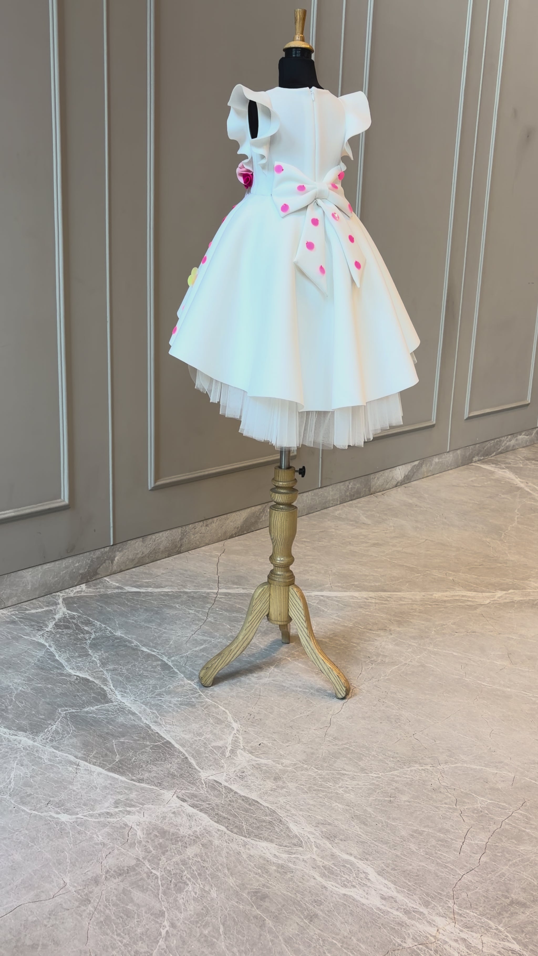 Lilac polka sequence and hand made bows short long gown with a neck and an armhole frill along with a back bow on the back side.