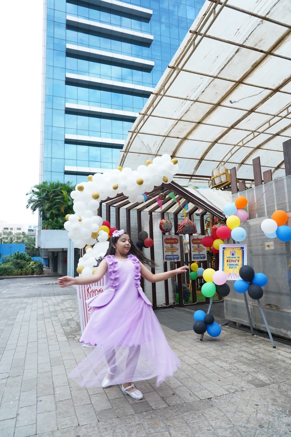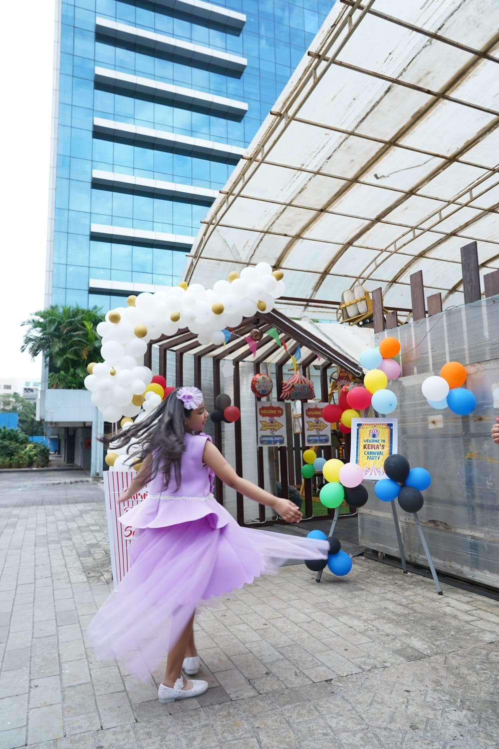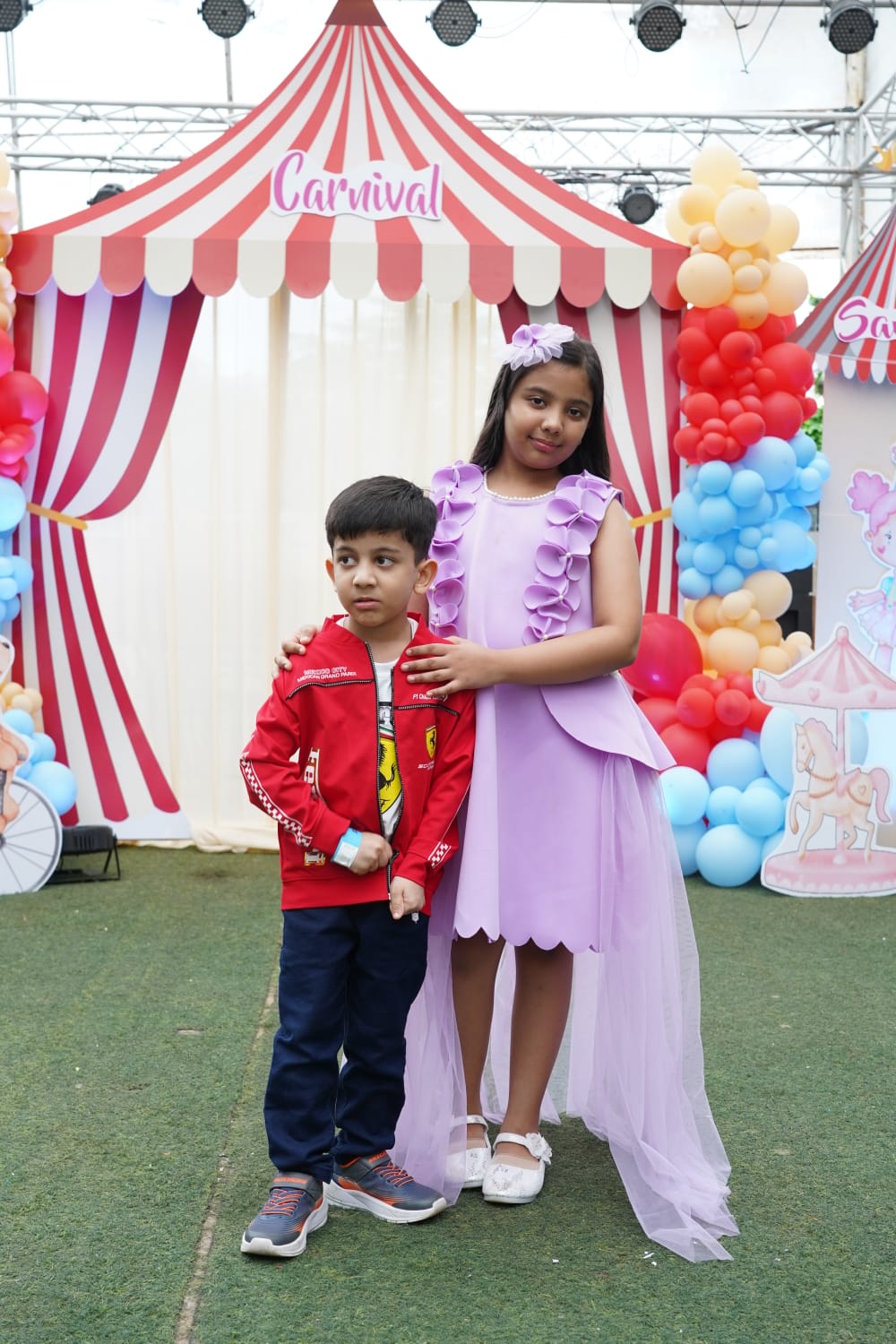 Lilac princess scallop A line knee length dress with a detachable net flair at the back.