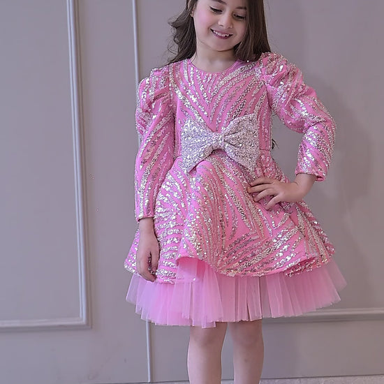 Lotus pink silver sequence full peplum knee length dress with a silver sequence bow on the front.