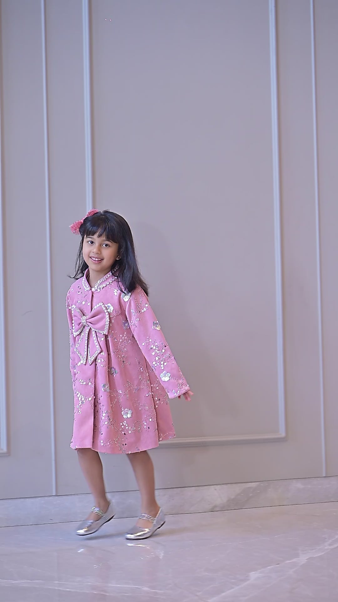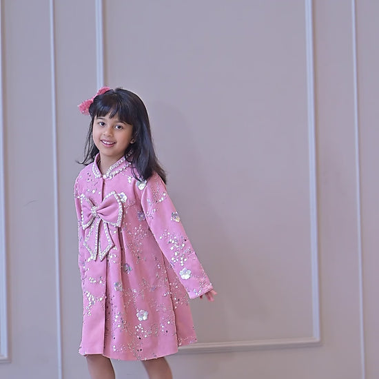 Lotus pink suede velvet embroidered knee length coat dress withn a hand made pearl sequence bow and collar details.