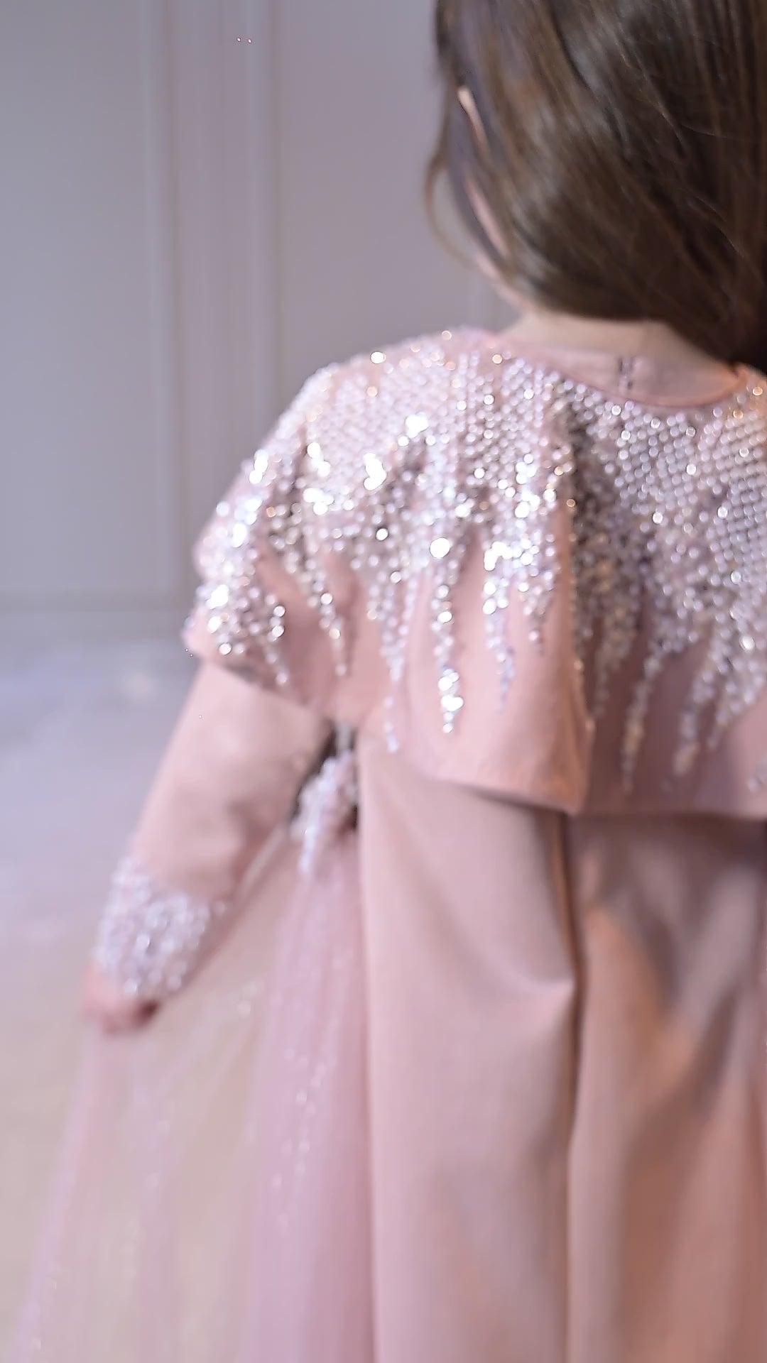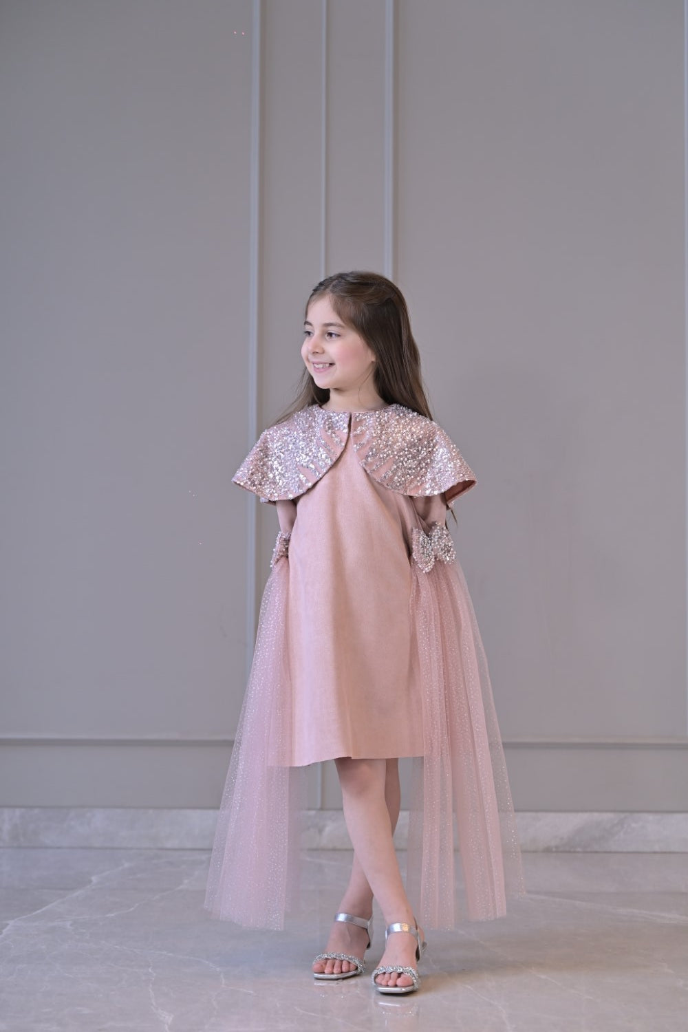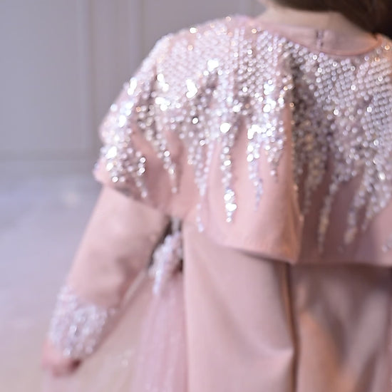 Nude sequence shoulder cape suede velvet knee length dress with detachable side bow net flairs.
