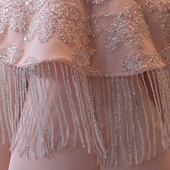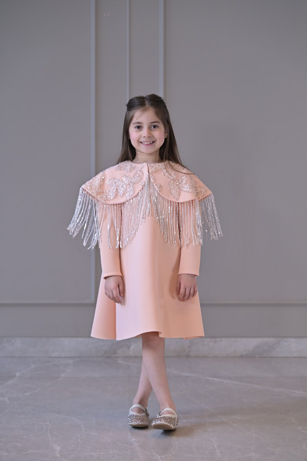 Peach knee length dress with a detachable embroidered shoulder cape attached with silver sequence hangings.