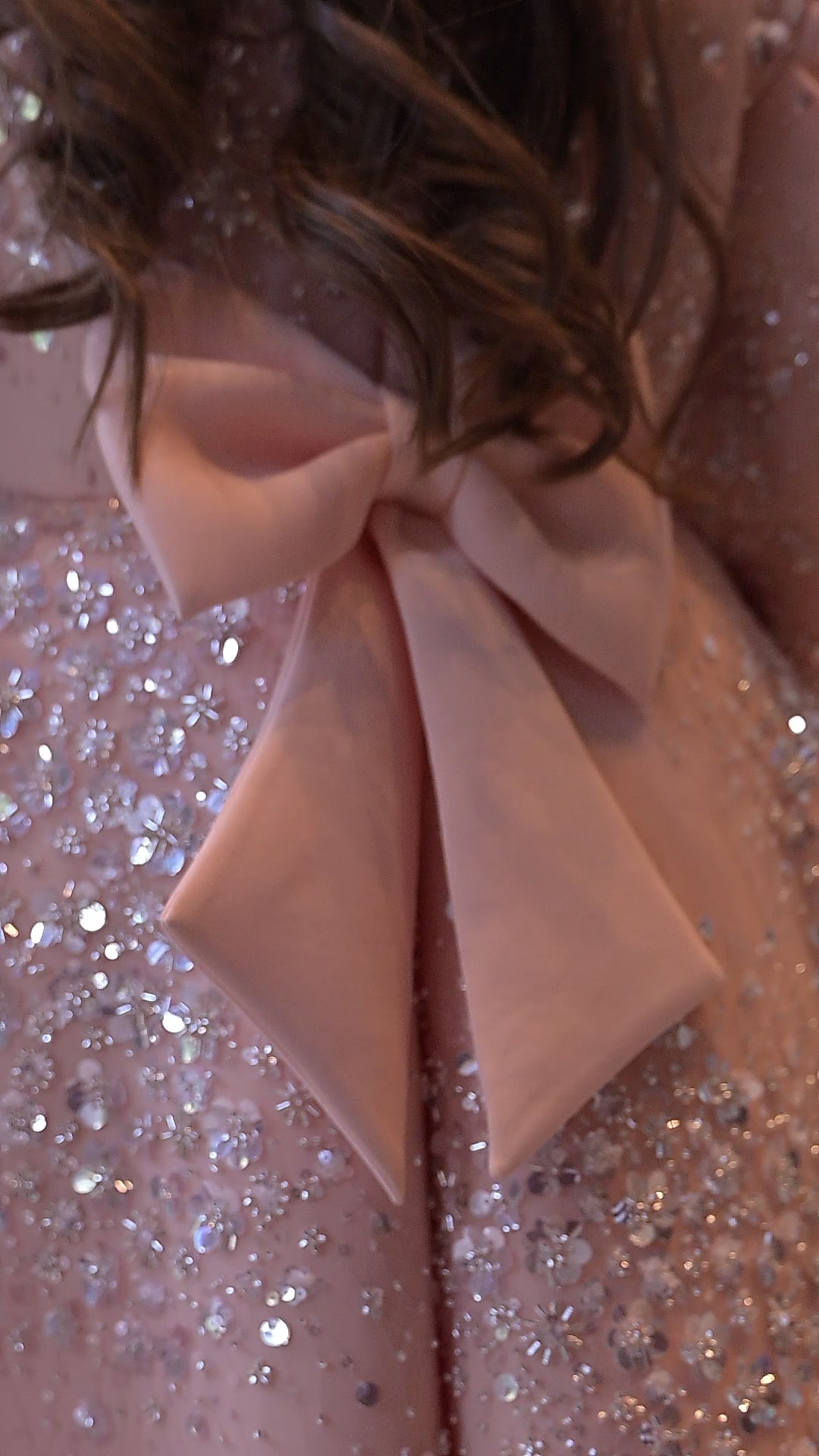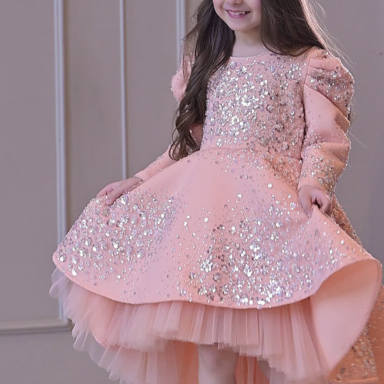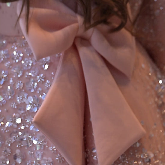 Peach silver jhilmil short long gown with net and a hand made bow with tassel at the back side.