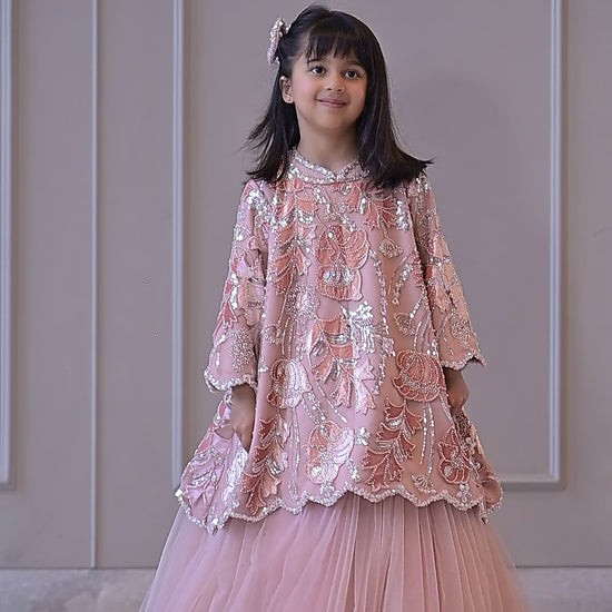 Pink peach velvet scallop sequence lehenga set with a collar.