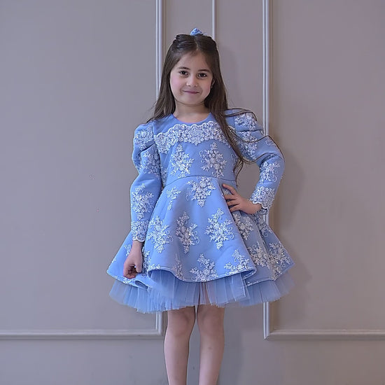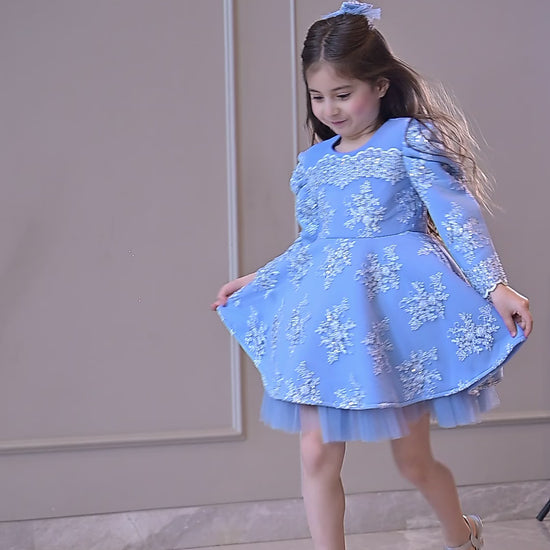 Powder blue embroidered full peplum knee length dress.