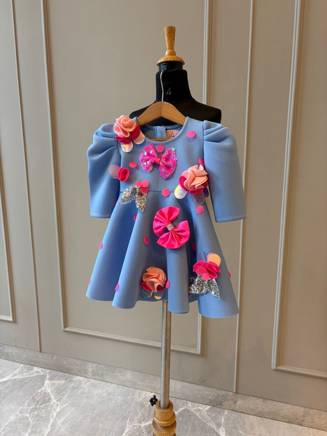 Powder blue polka sequence bows knee length dress with box pleat sleeves.